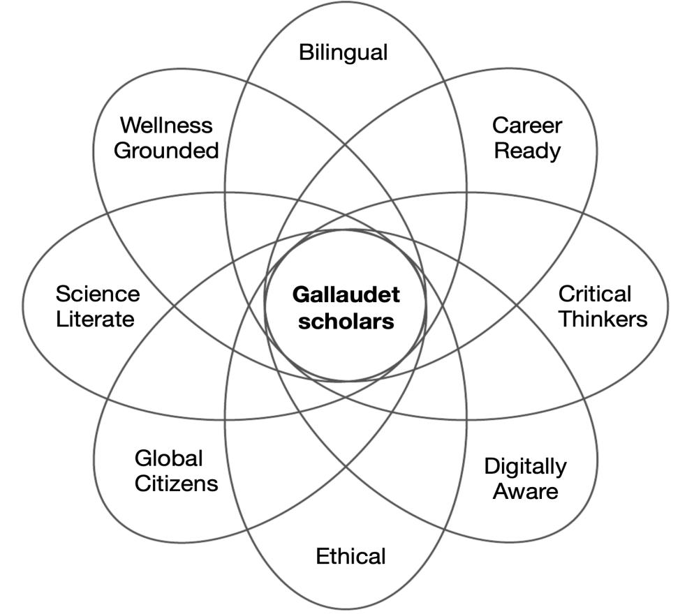 A Gallaudet education provides students with opportunities to develop as wellness-grounded, proudly bilingual, career-ready critical thinkers, who are digitally aware, ethical, scientifically literate global citizens. Gallaudet’s curriculum provides learning experiences to promote the development of Gallaudet Scholars:
