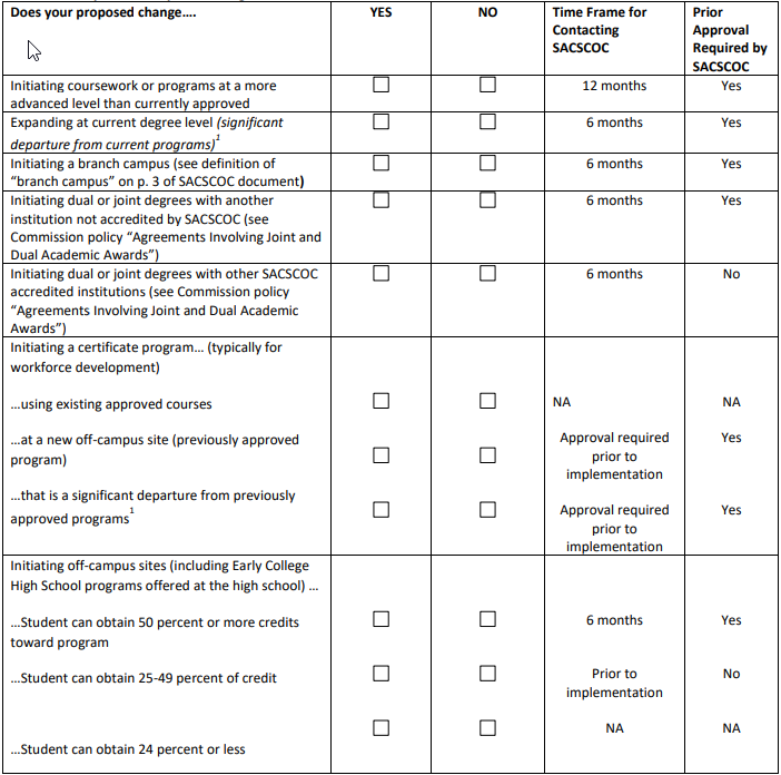 | Initiating dual or joint degrees with other SACSCOC accredited institutions (see Commission policy “Agreements Involving Joint and Dual Academic Awards”) |