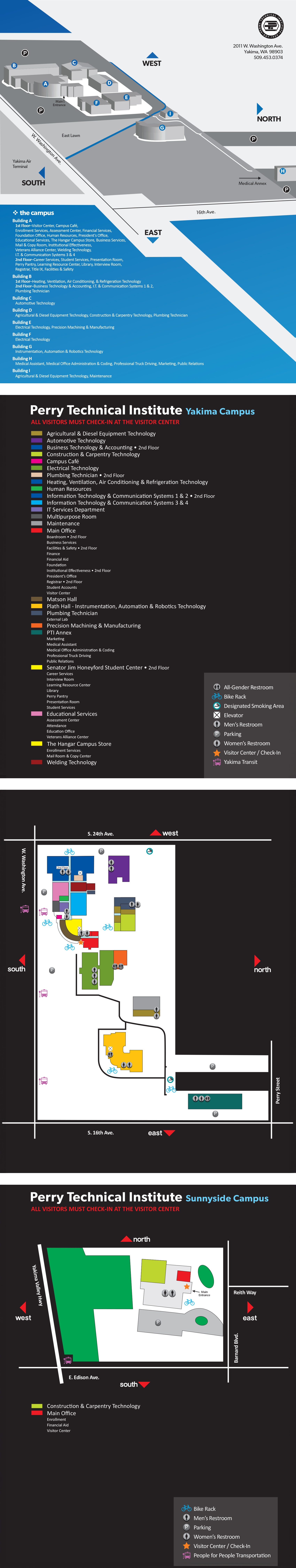 The Perry Technical Institute main campus is located at 2011 W. Washington Ave., on approximately 35 acres of land on the southwest edge of Yakima, Washington, across the street from the Yakima Air Terminal. The Professional Truck Driving Program uses a lab space located at 1301 S. Fair Avenue which is approximately four miles from the main campus. The Construction & Carpentry Technology program at Perry Tech Sunnyside is situated at 437 Barnard Blvd, Sunnyside, WA 98944, approximately 38 miles away from the main campus.