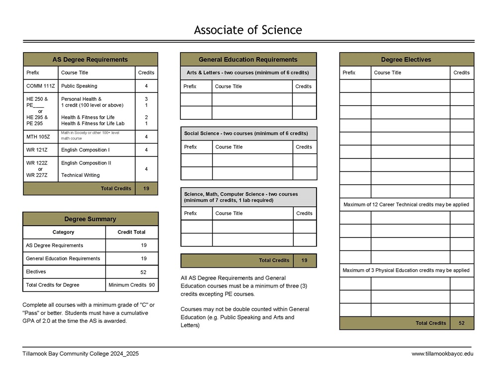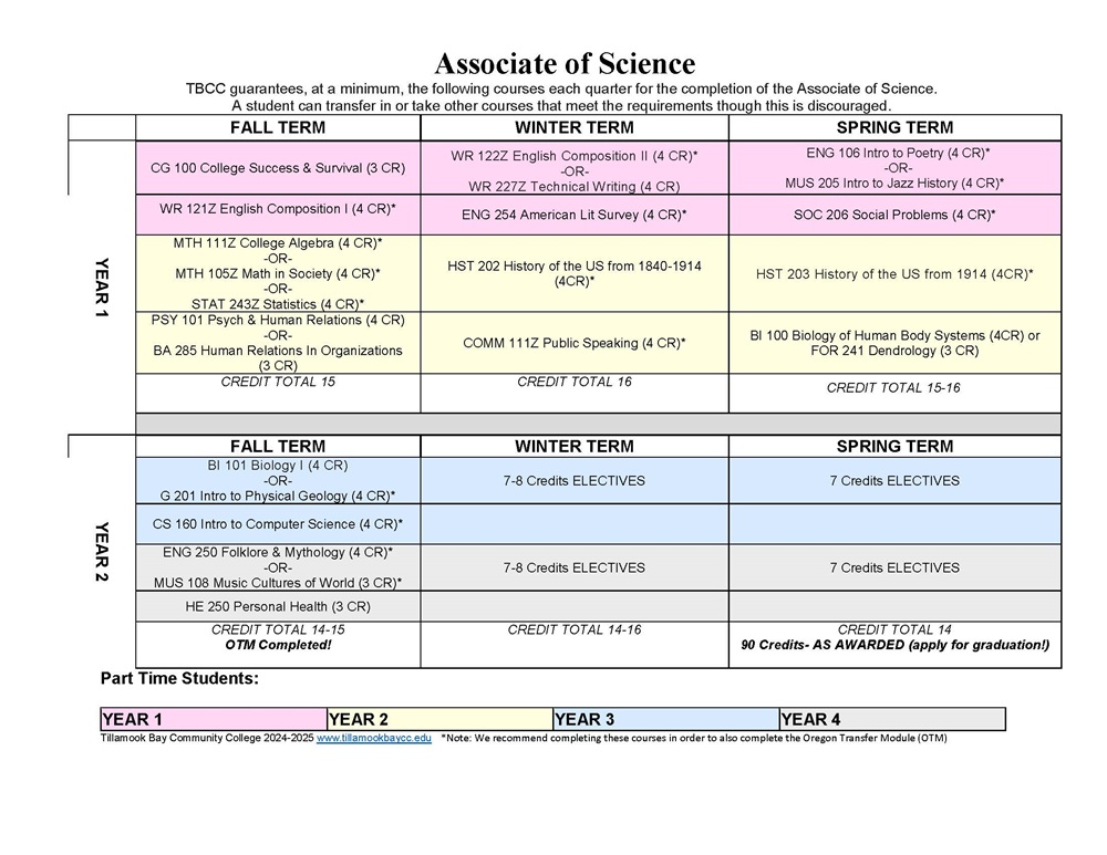 The Associate of Science/Arts degree is designed for students planning to transfer credits to a baccalaureate degree program at a four-year institution within Oregon public universities. It allows for more freedom in course selection than the AAOT/ASOT, but does not guarantee that students will be accepted as having completed all lower division comprehensive and general education requirements for a baccalaureate degree.