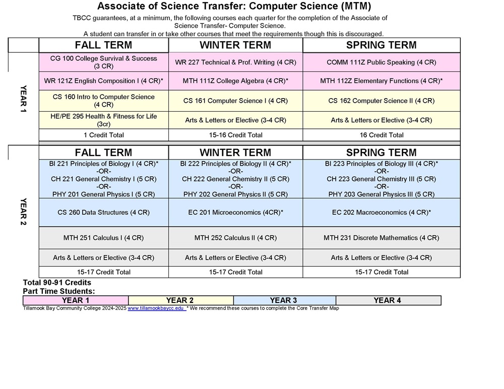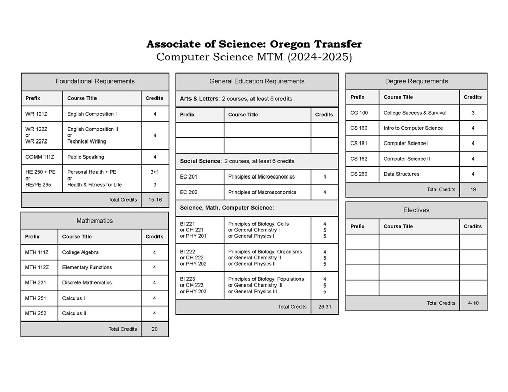 The Computer Science Major Transfer Map (MTM) outlines Oregon community college coursework to complete in order to transfer seamlessly to any Oregon four-year public university to earn a bachelor of science (B.S.) in computer science. The Computer Science MTM is intended for students who know they want to transfer and earn a B.S. in computer science, but who are unsure of their intended transfer destination when they begin their community college studies. Students should work with their community college advisor to ensure they properly fulfill the requirements of this Computer Science MTM.