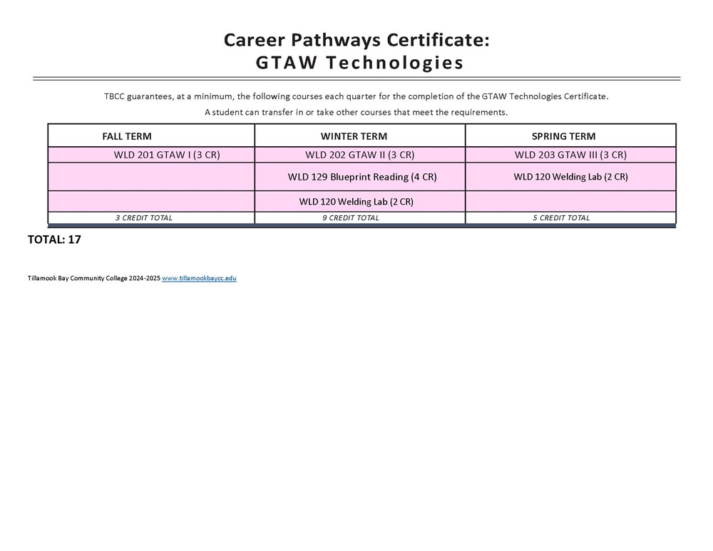 2024-2025 College Catalog > Degrees Certificates and Apprenticeships > Career Technical and Career Pathway Certificates > Welding Certificates > GTAW Technologies