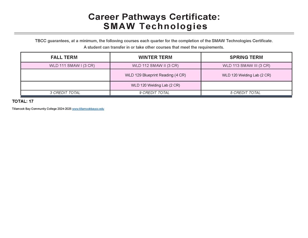 2024-2025 College Catalog > Degrees Certificates and Apprenticeships > Career Technical and Career Pathway Certificates > Welding Certificates > SMAW Technologies