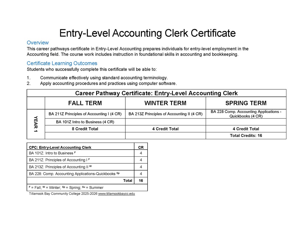 The career pathways certificate in Entry-Level Accounting prepares individuals for entry-level employment in the Accounting field. The course work includes instruction in foundational skills in accounting and bookkeeping.