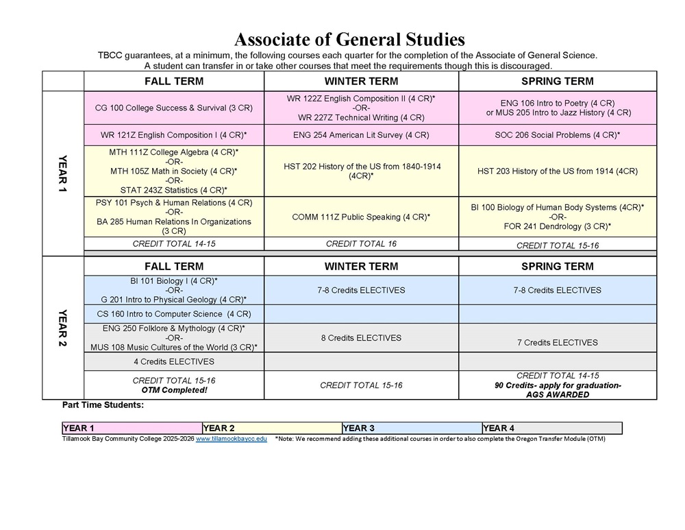 The Associate of General Studies is designed for students wishing to acquire a broad education, rather than pursuing a specific college major or career and technical program. College work may include courses selected from a variety of career and technical education and college transfer courses. Because of the flexibility of this degree, it may not fulfill requirements for transfer to four year institutions. Students are responsible for checking with the college of their choice if transferability is desired.
